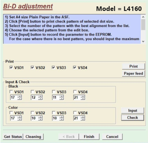 El BI-D Adjustment, también conocido como ajuste bidireccional, sirve para calibrar la precisión del cabezal de impresión en la dirección de avance y retroceso. En otras palabras, este proceso garantiza que las líneas impresas por la Epson L4160 estén perfectamente alineadas, evitando desplazamientos o duplicados.